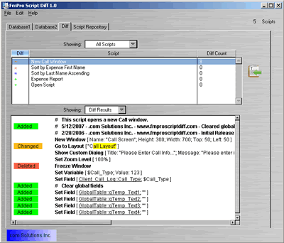 using the Diff screen menu item Changed Scripts. The list of