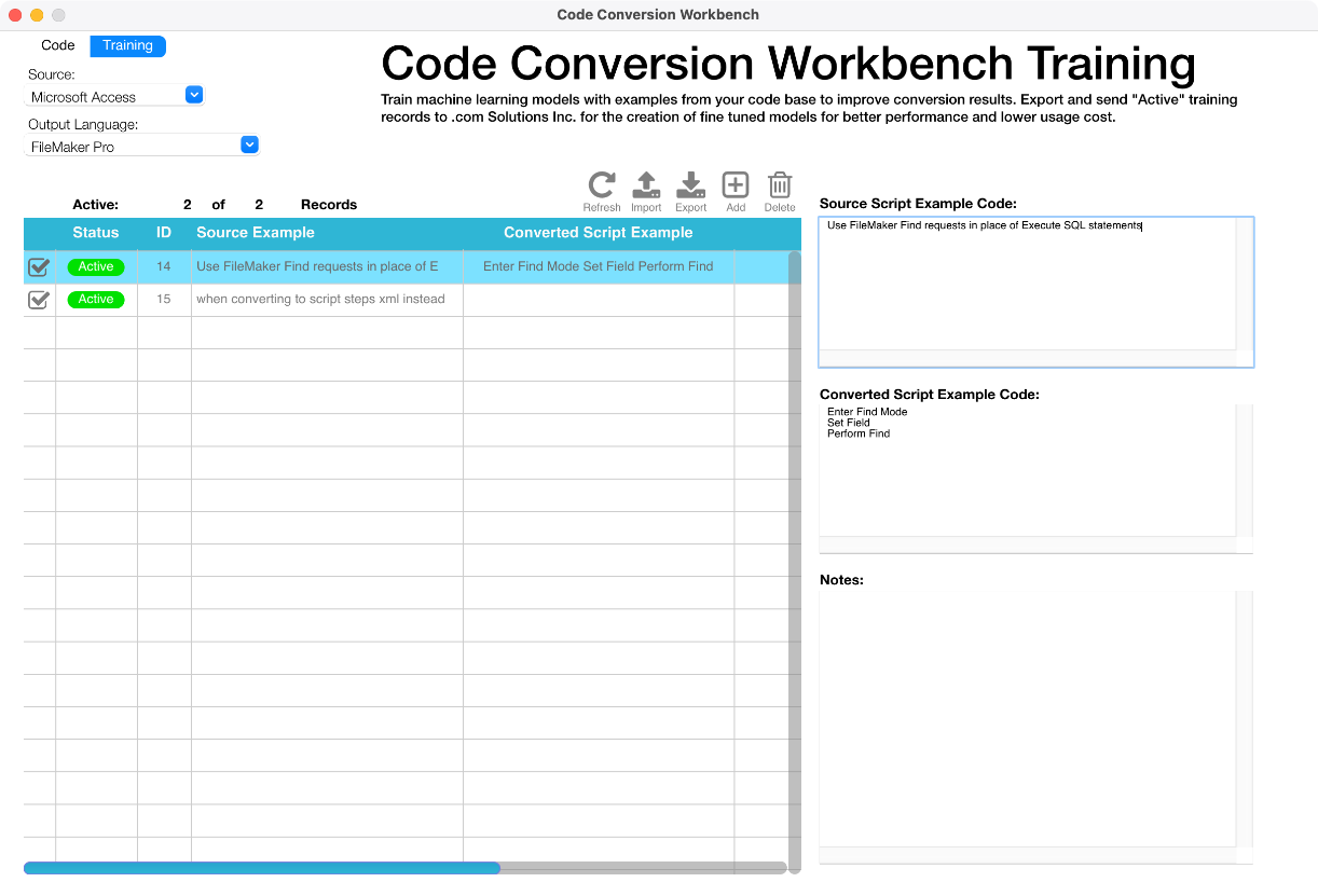 The Microsoft Access Code Conversion Workbench enables FileMaker developers to manage the automated conversion of hundreds of Access VBA scripts within an entire Microsoft Access project in a single window. Individual scripts can be selected by name for single-click submission to the selected AI provider and machine learning model. Output files are saved automatically as the results are received into a folder of converted scripts. Machine learning prompts are generated automatically, but the prompt text and source code fields are fully editable. Part of the secret sauce of this tool includes the system prompts and setup parameters which are built into the workbench software.