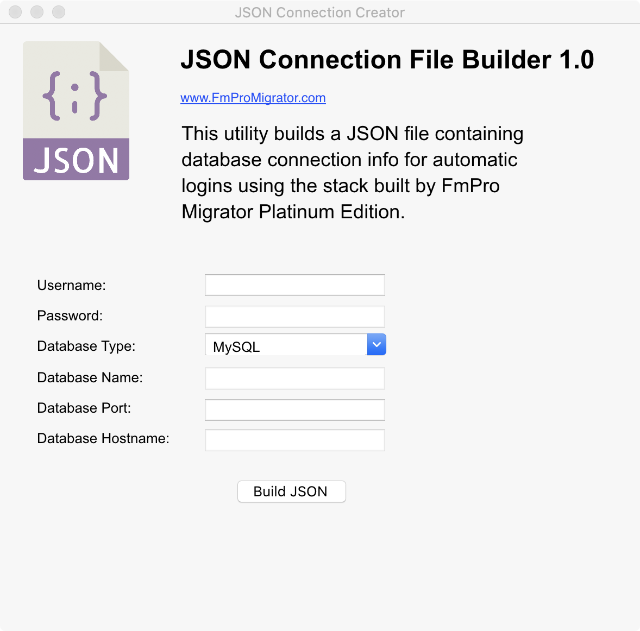 The JSON Connection File Builder stack builds a database connection JSON file named DBConnection.JSON. This stack is written to disk with other utility stacks as part of the automated conversion. The JSON Connection File Builder utility encrypts the contents of the password field before writing the JSON file. By distributing this stack and its source code, it provides ideas to developers for turning this tool into a more extensive utility for production use. A more extensive tool could be developed to automate the on-boarding process for new customers. |